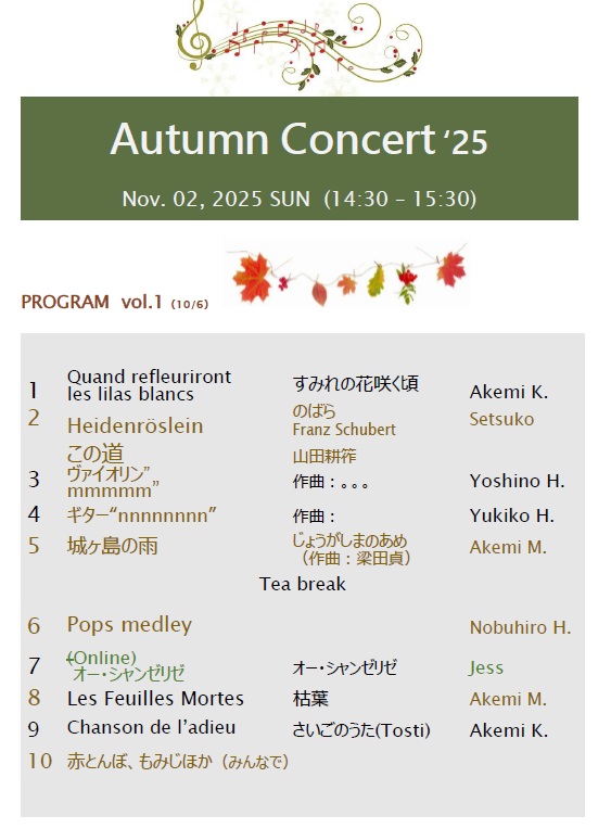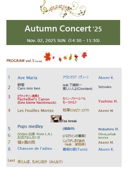 Sept 24 (Mail to K)ところで,夏のラメールコンサートに出なかったバイオリン🎻の小学生さんが,Eine Klaine Nachtmusik をやっているので,機会があったら演奏したいそうです。私のリハビリ促進のため,またうちに来て歌ってくださいますか?11月の初め頃はどうでしょうか?