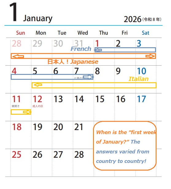 The cultural difference between French, Italian and Japanese on how to define “the first week of XXX”! So interesting!! It was possible to do research as I had many friends.